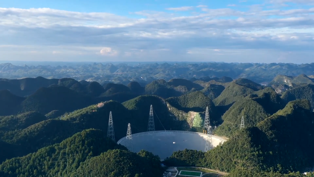 在天坑群中有一个叫“大窝凼”的地方,一只银色的巨眸正凝视苍穹。这就是世界最大的单口径球面射电望远镜“中国天眼”所在地。当夜幕降临,“中国天眼”便化身为一位虔诚的聆听者,收集着来自亿万光年外的讯息,将人类对宇宙的想象推向更远的边界。
