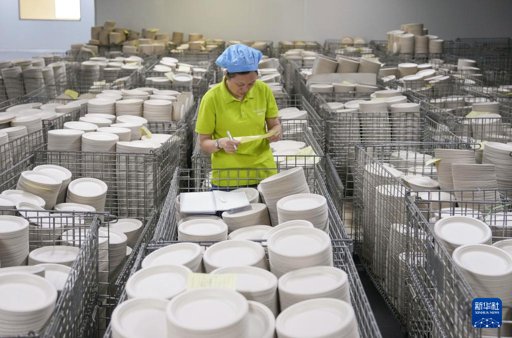 4月15日,工作人员在位于云南省临沧市的绿赛可新材料(云南)有限公司包装车间内查验可降解餐具产品。