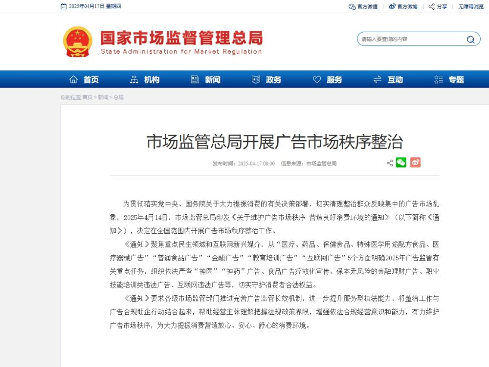 为贯彻落实党中央、国务院关于大力提振消费的有关决策部署,切实清理整治群众反映集中的广告市场乱象,2025年4月14日,市场监管总局印发《关于维护广告市场秩序 营造良好消费环境的通知》(以下简称《通知》),决定在全国范围内开展广告市场秩序整治工作。