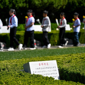 清明节前,河北省平山县雷烨希望小学师生共同缅怀雷烨烈士(2025年3月31日摄)。新华社记者 刘金海 摄