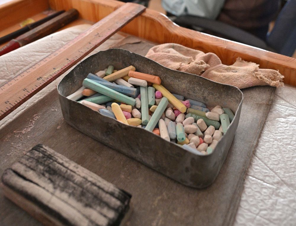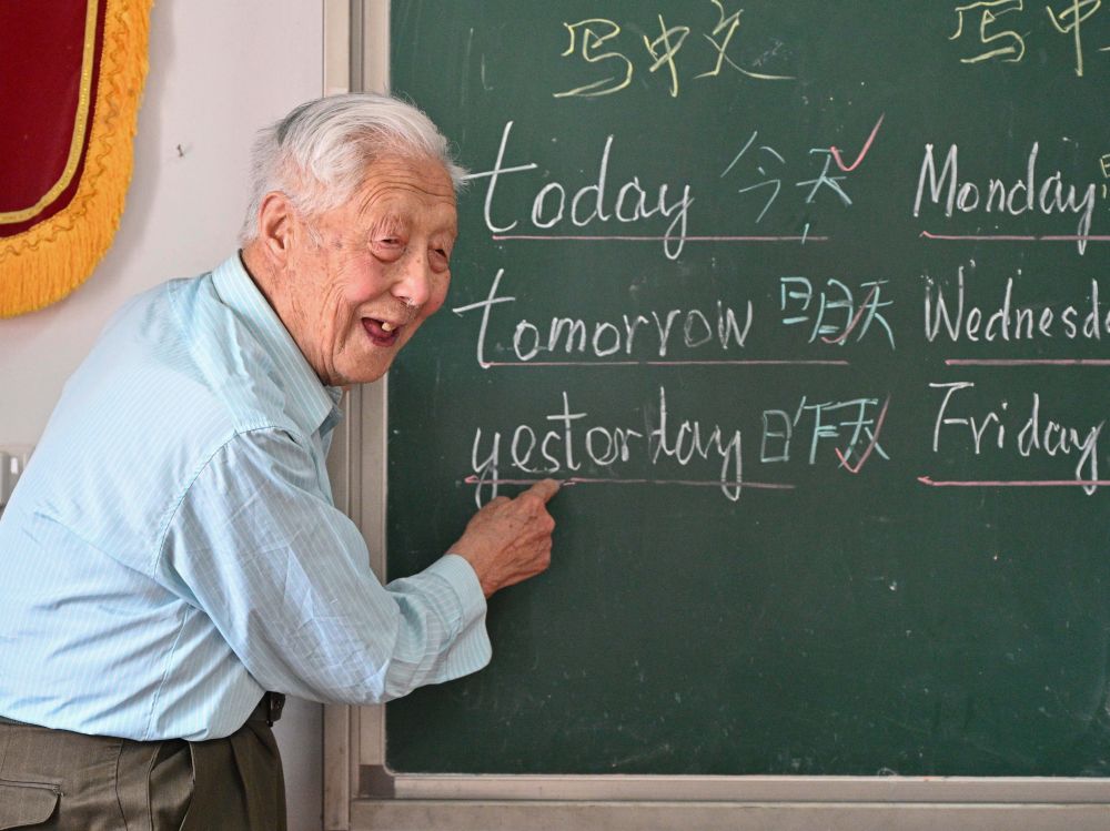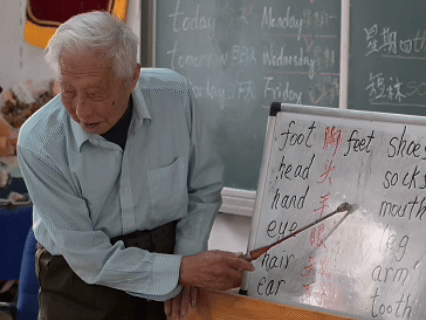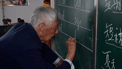 ↑4月8日,叶连平在写板书时用手紧抓黑板,以支撑身体。