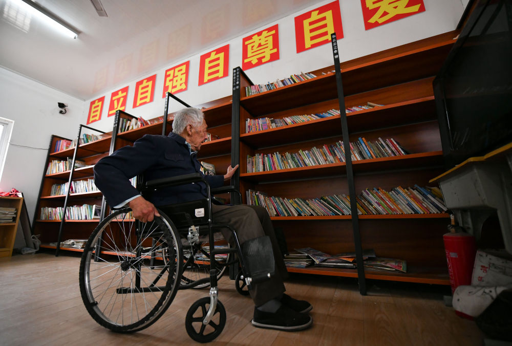 ↑4月9日,叶连平在卜陈村“留守未成年人之家”阅览室整理图书。叶连平自费为阅览室购买了很多图书。