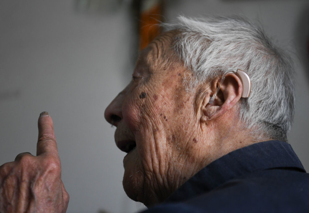 ↑4月9日,叶连平在卜陈村“留守未成年人之家”批改学生作业。由于视力下降,他批改作业时眼睛离桌面很近才能看清。
