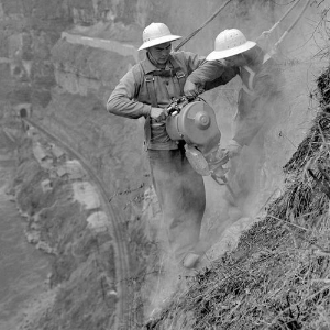 1974年3月,四川西昌铁路分局乌斯河工务段工人排除大渡河两侧悬崖峭壁上的危岩和孤石,保证成昆铁路安全通车。 新华社记者 李基禄 摄