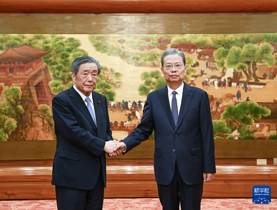 4月29日,全国人大常委会委员长赵乐际在北京会见日本日中友好议员联盟会长、自民党干事长森山裕。新华社记者 张领 摄