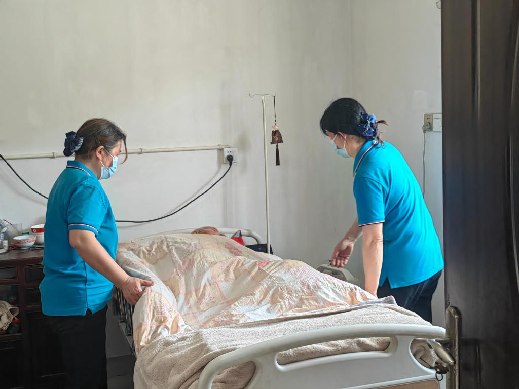 “爷爷好,我们给您测下血压。”4月29日上午10点,长期照护师王汝芳和搭档崔恒霞来到江苏省海安市的失能老人陈爷爷家。测量血压、脉搏、呼吸,剃胡须、洗头、擦拭身体、换床单……一系列熟练、专业的操作,让陈爷爷的老伴丁奶奶竖起大拇指。