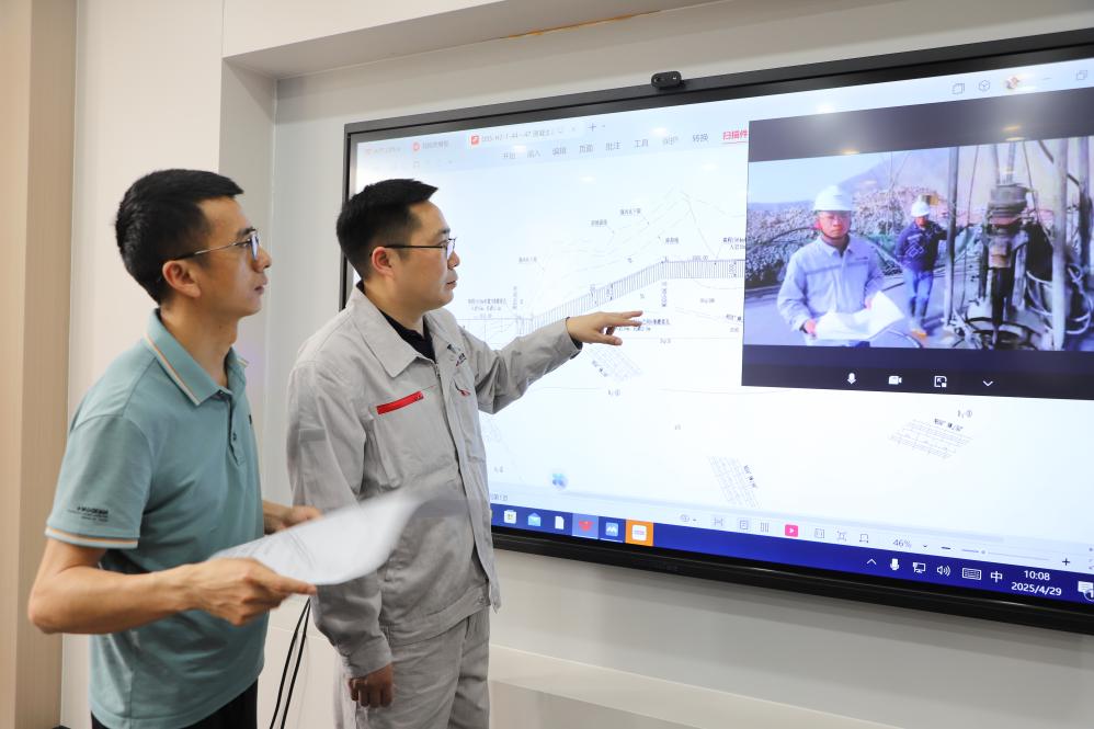 4月29日,秦名奎(右一)通过视频连线,远程指导新疆大石峡水利枢纽工程钻探灌浆施工作业。(受访单位供图)