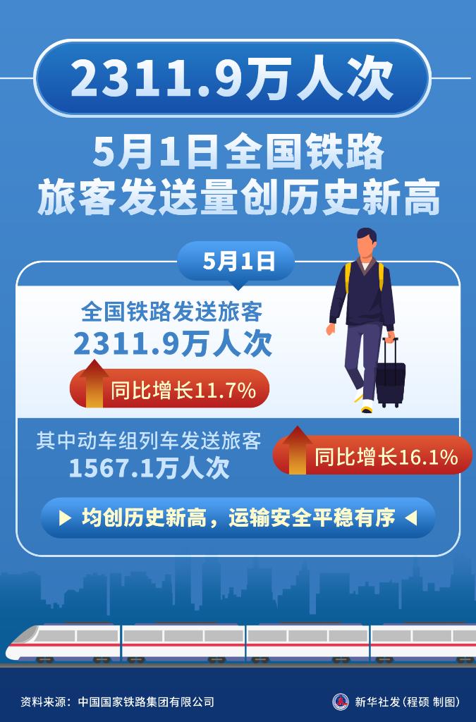 新华社北京5月2日电(记者樊曦)记者从中国国家铁路集团有限公司获悉,5月1日,全国铁路发送旅客2311.9万人次,其中动车组列车发送旅客1567.1万人次,同比分别增长11.7%、16.1%,均创历史新高,运输安全平稳有序。