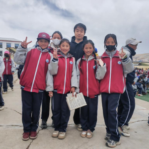 2025年4月26日,范宇翔与曲麻莱县民族中学的学生合影。新华社记者 王梓涵 摄
