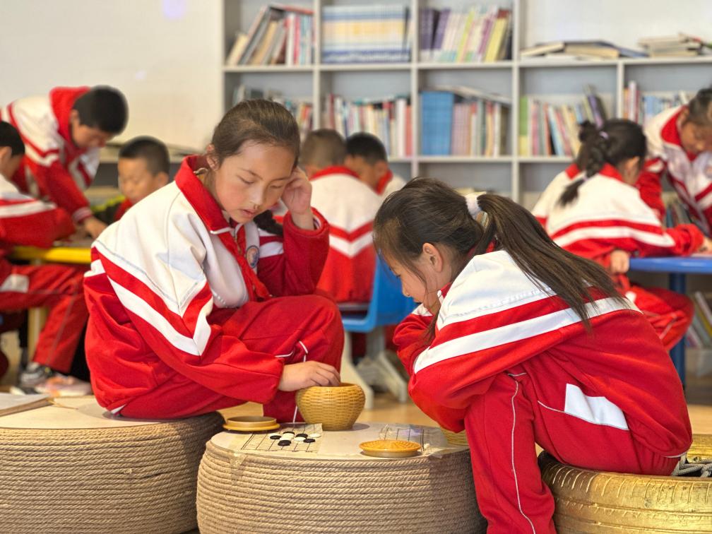 池汉学校教学楼休闲长廊,孩子们在下棋。新华社记者 张子琪 摄