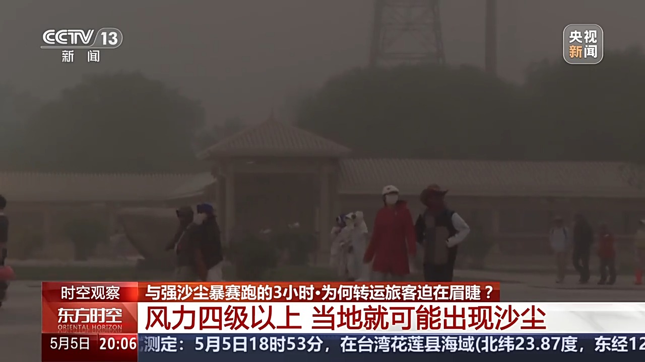 总台记者 王妍:我在敦煌当地了解到,由于受蒙古高压和地形地貌的共同作用,气候干旱,降水稀少,风沙频繁,敦煌其实具有典型的沙漠气候特征。而且敦煌位于多个沙漠包围区域,周边塔克拉玛干沙漠、库姆塔格沙漠的沙源丰富,只要风力达到4级以上,便可掀起沙尘。因此沙尘天气在敦煌不算少见。但今年“五一”遭遇这么大的沙尘暴,在当地人看来,也算罕见,敦煌气象局工作人员告诉我,这一次强沙尘暴天气中,敦煌市能见度小于500米,市区最大风力达到9级,雅丹地区最大风力达到12级。