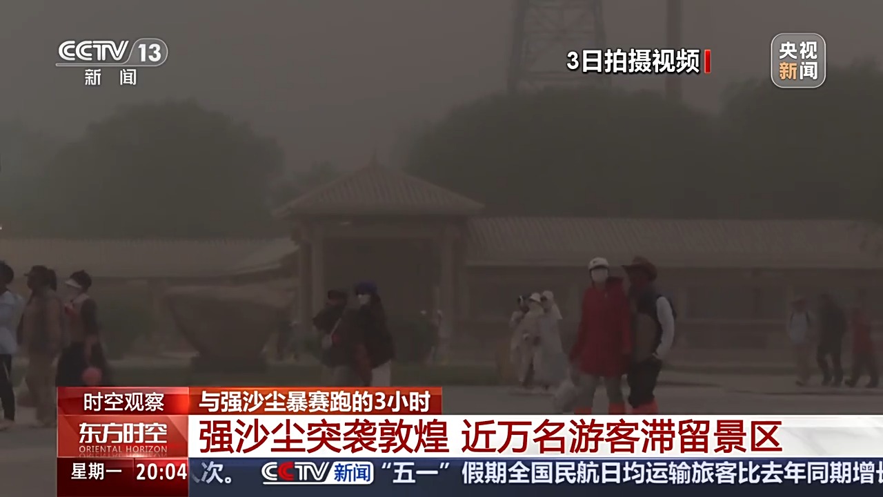 这个“五一”假期,敦煌再次人山人海。不过就在5月3日傍晚,敦煌市刚刚经历了一场部分地区最大风力达到12级的强沙尘暴。当时,有近万名游客滞留在敦煌的几个景区内,敦煌市立即启动恶劣天气应急预案,与强沙尘暴赛跑,3个小时内,就把所有滞留的游客安全地送回了市区。5月5日,敦煌的景点照常开放,星空音乐会万人大合唱等活动照常举行。