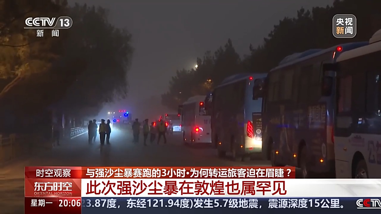 总台记者 王妍:据我了解,这也是敦煌市首次启用公务用车用于极端天气下的游客转运。敦煌市机关事务中心调用了七座以上的公务车共计14辆。这也是敦煌市所有的7座以上公务用车了。这也是由于本次沙尘暴的级别,符合《敦煌市重大沙尘暴灾害应急预案》中,当沙尘暴天气造成的危害程度超出本单位控制能力,需要敦煌市政府提供援助和支持的,由应急指挥中心报请上级有关部门协调相关资源和力量参与事件处置。我在敦煌市重点工作联系群中看到,3日18时30分,敦煌市主要领导通知启动大风天气预案,开展全市调度,21时05分,鸣沙山月牙泉景区所有游客疏散完毕。不到3个小时的时间,所有的滞留游客全部完成转运和安置。