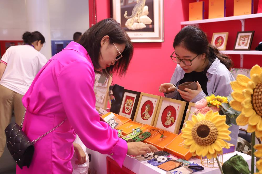 2024年5月23日,2024年中国(深圳)国际文化产业博览交易会上,顾客选购首批“美丽工坊”深圳市大爱艺术品有限公司推出的鱼皮画、鱼皮装饰手机壳等饰品。(万里 摄)