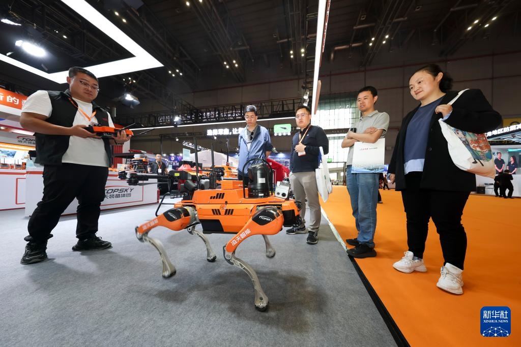 5月13日,在北京凌天智能展位,工作人员为参观者演示可用于应急救援的四足机器狗。新华社记者 王翔 摄