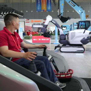 5月15日,参展商在第四届长沙国际工程机械展览会现场演示操作全电动挖掘机器人。新华社记者薛宇舸 摄