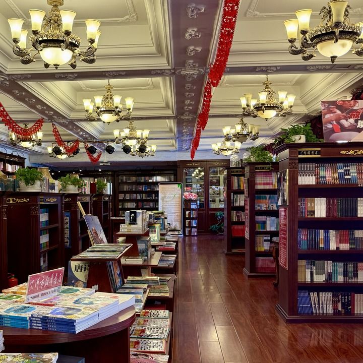 这家书店不大,深棕色实木书架整齐排列,红色丝绒窗帘古朴典雅,淡黄色灯光柔和地洒下。这里原是当地的新华书店,经精心改造,巧妙融入俄式风格,被不少网友称为“最美国门书店”。