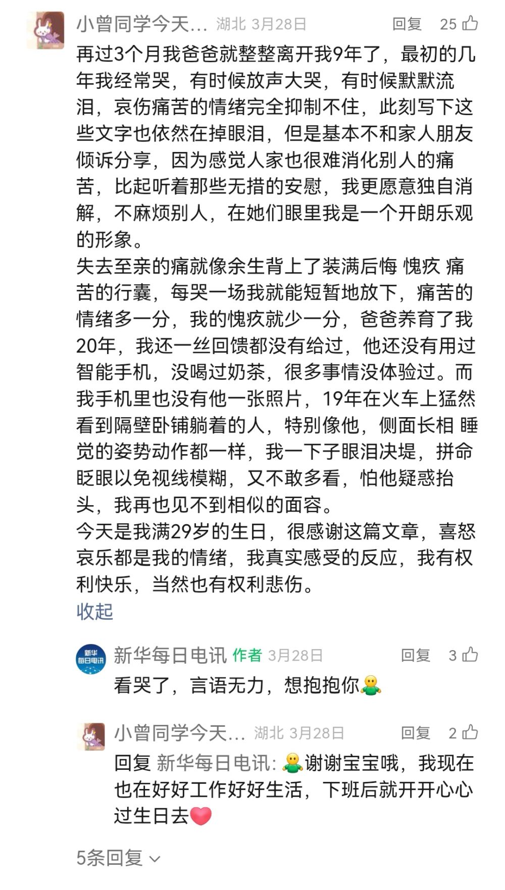 稿件推送那天,是网友“小曾同学”29岁的生日。她告诉我们,爸爸离世将近9年,她依然在与哀伤共处,以至于打下那段留言时还止不住地流泪。她说自己总是感到内疚和遗憾,“爸爸养育了我20年,我还一丝回馈都没有给过,他还没有用过智能手机,没喝过奶茶,很多事情没体验过”,思念太甚,她会在坐卧铺火车时,从陌生人身上看到爸爸的影子,“特别像他,侧面长相,睡觉的姿势动作都一样”,泪水决堤,她想看清又不敢久看,怕被人家发现……她写得太动情,我想要安慰又不知该说些什么,最后只回复了一句“言语无力,想抱抱你”。“小曾”用那个张开双臂的微信表情抱了回来,又发了一段话:“我现在也在好好工作好好生活,下班后就开开心心过生日去”,像是想让小编放心。“小曾”的留言下方,祝她生日快乐的网友排起了长队,其中包括我的同事,采写这篇报道的记者。
