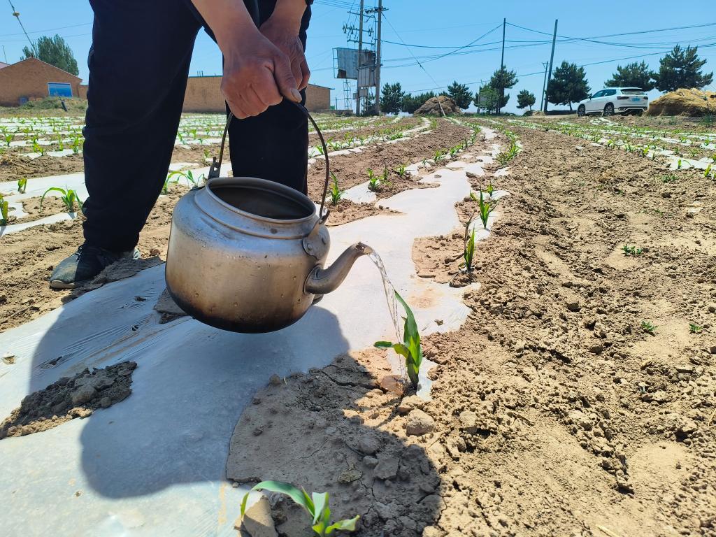 甘肃省庆阳市环县环城镇龚淌村位于远离河流的半山腰上,农户大多靠自家集雨场窖存水进行小面积点灌。记者在59岁的村民刘彦河家中看到,他用烧水壶打了水窖中的存水,给每株苗精准“喂水”。