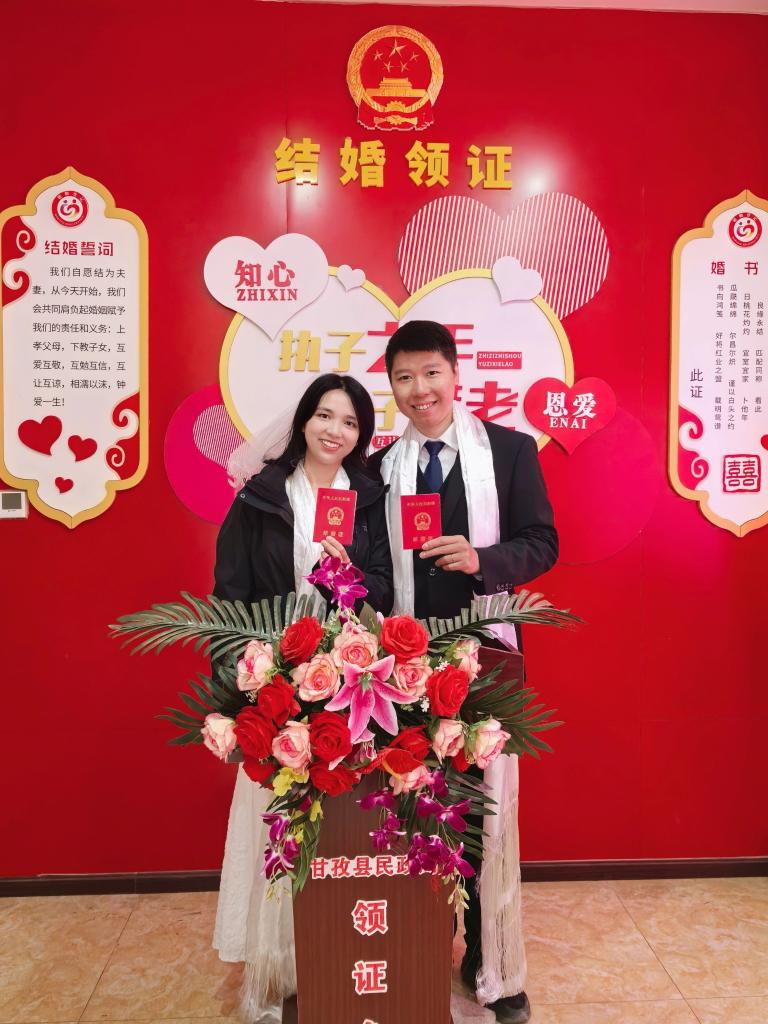 珊珊(左)和爱人在四川甘孜藏族自治州领取结婚证。(受访者供图)