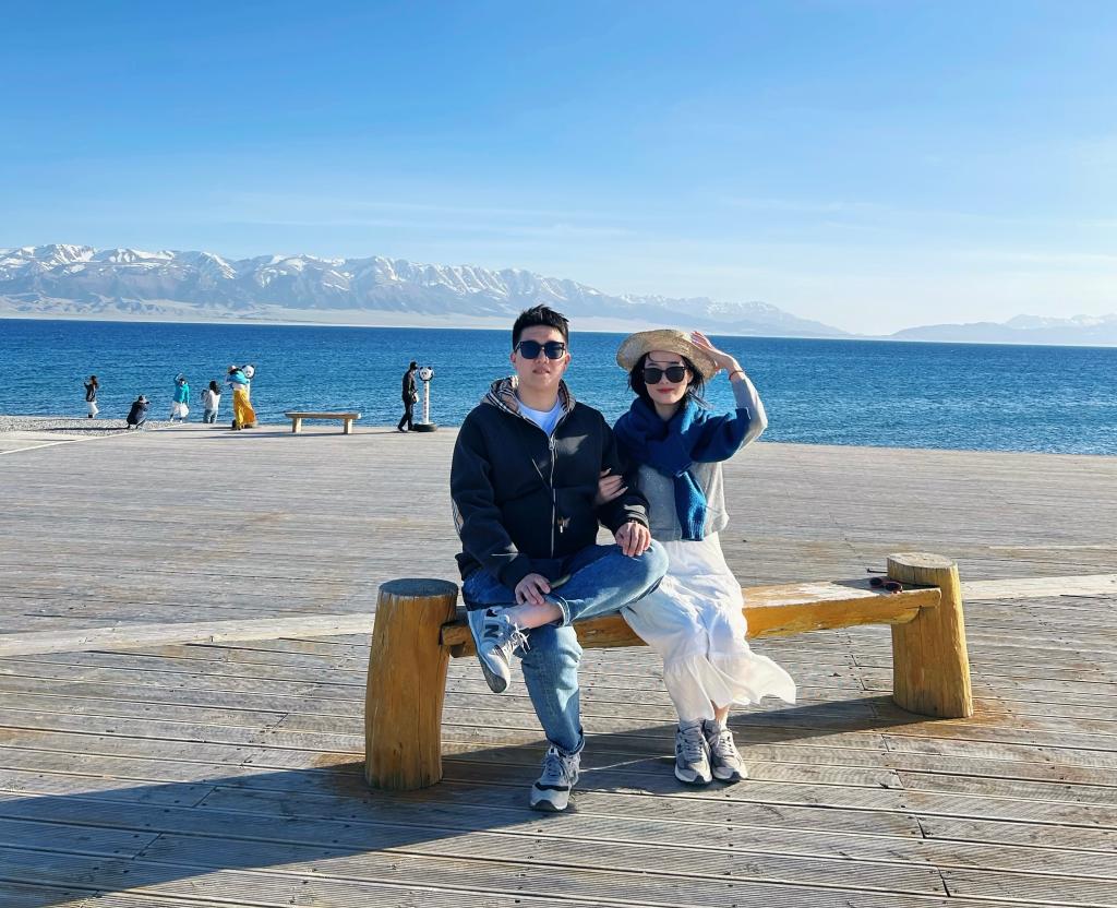 阿苹(右)和爱人在新疆赛里木湖景区合影。(受访者供图)