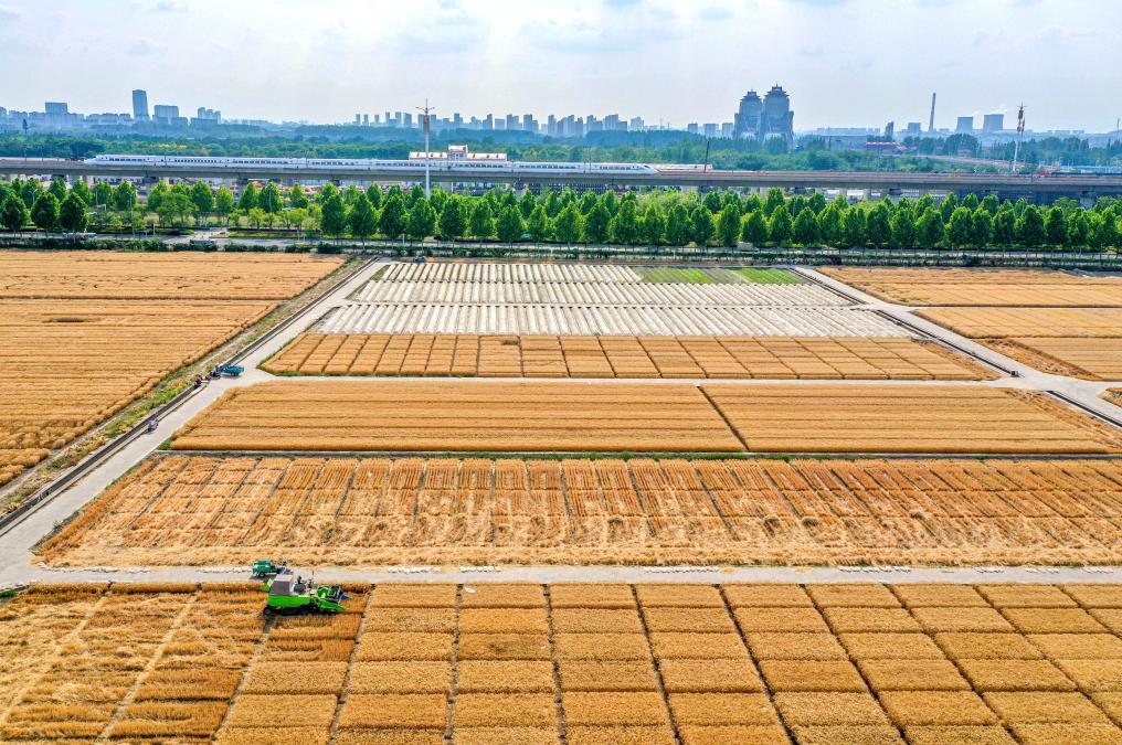 5月20日,在江苏里下河地区农科所(扬州市农科院)试验田,农民驾驶收割机收割小麦(无人机照片)。新华社发(任飞摄)