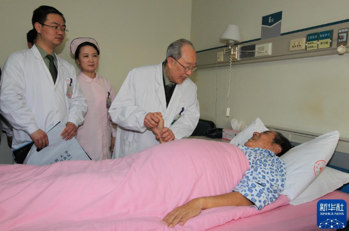 2011年4月14日,吴孟超(左三)带领医护人员查房。新华社记者 王建民 摄