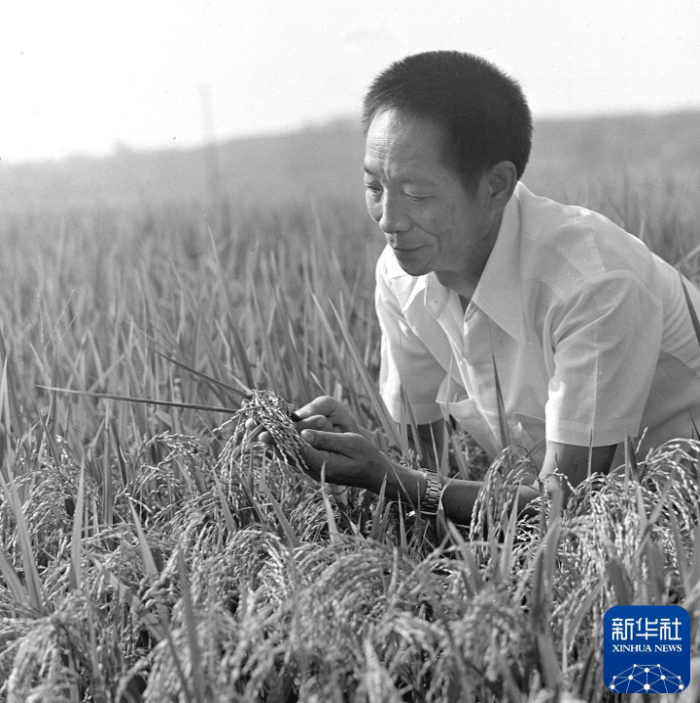 1995年,袁隆平在杂交稻田间考察。新华社记者 殷菊生 摄