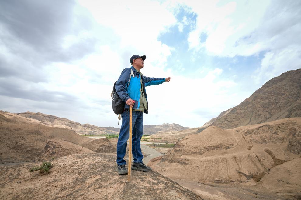 5月13日,李世翔在黄河黑山峡考察途中,站在一处秦兵营遗址上遥指对面山上的长城。