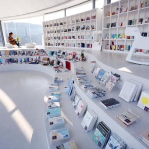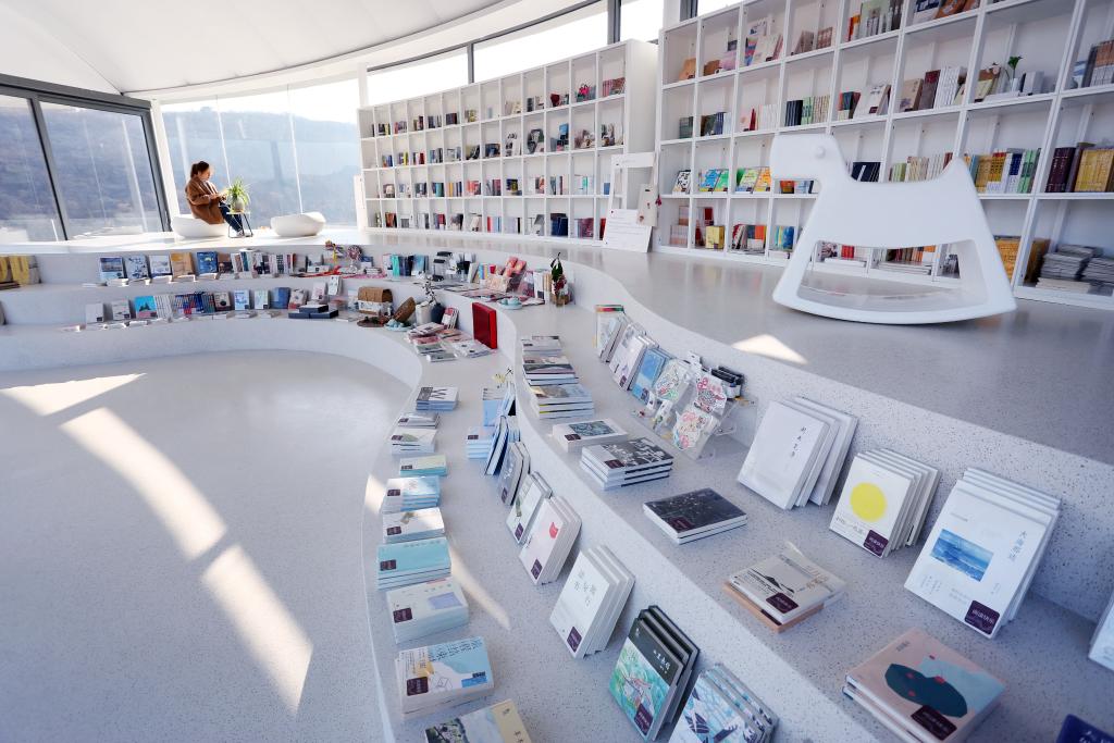 顺着蜿蜒的小路拾级而上,峰回路转之间,记者见到这个“网红书房”的全貌:白色的膜结构屋顶,透明的玻璃落地窗,流线型的外立面设计,九女峰书房宛如白云停留山间。室内延续素雅基调,弧形书墙与阶梯式平台错落有致,长廊串联咖啡区和阅读区。三五游客或品茗阅读,或凭窗远眺,尽享山间静谧。