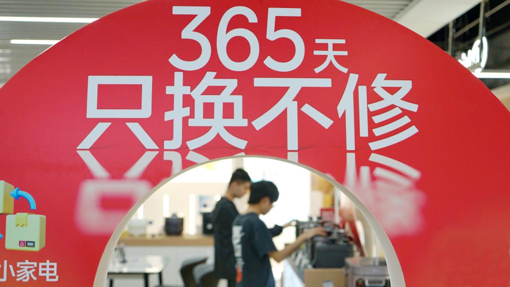 3月6日,学生在山东省青岛恒星科技学院开展的消费品以旧换新活动中选购手机。新华社发(张鹰 摄)