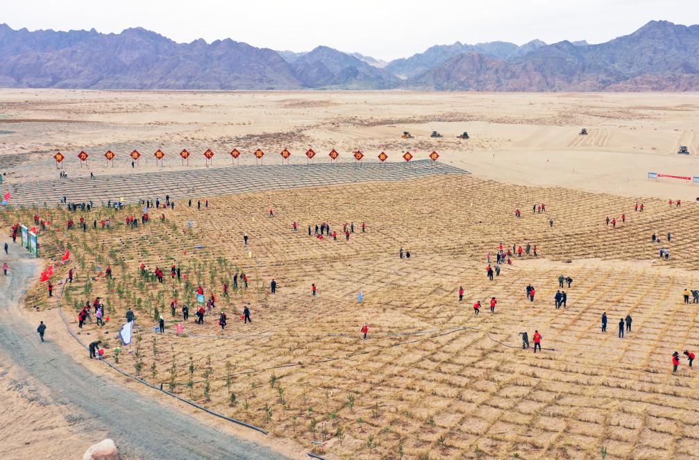 内蒙古巴彦淖尔市乌拉特后旗西补隆林业管护中心进行春季造林。新华社记者李云平 摄