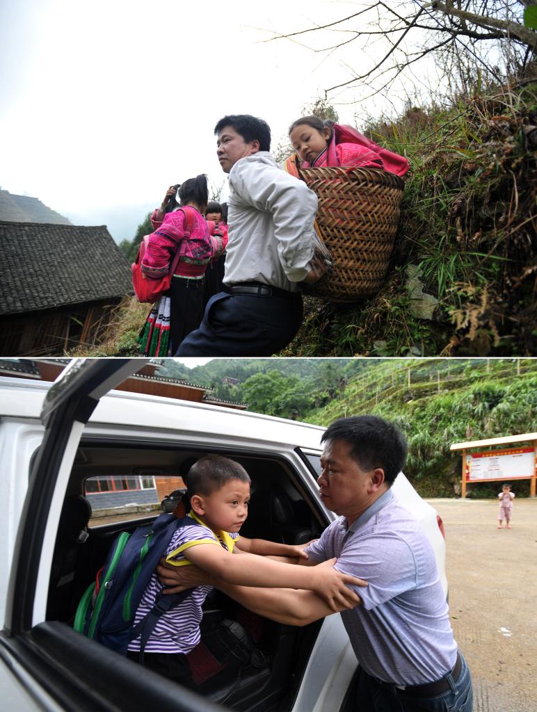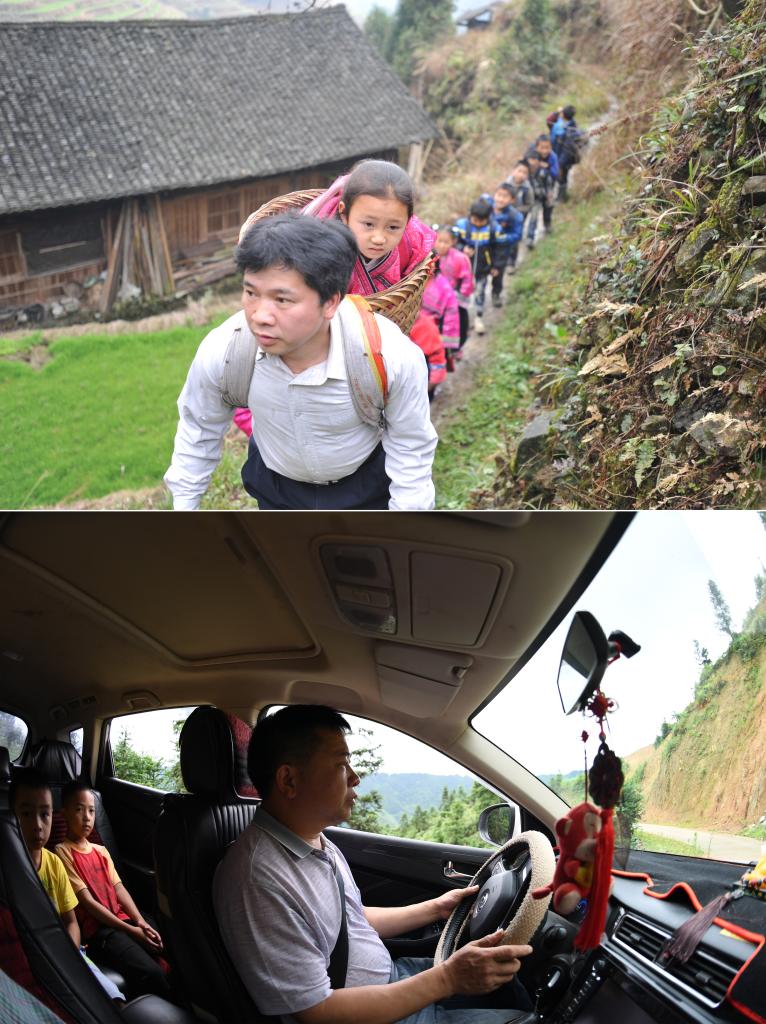 这是一张拼版照片,上图:在广西龙胜龙脊镇江柳村,余启贵在放学路上将一个走不动了的孩子背在背篓里,领着其他孩子一起回家(2013年2月26日摄);下图:在广西龙胜龙脊镇江柳村,余启贵开着自己的汽车带着学生去学校(2020年7月7日摄)。