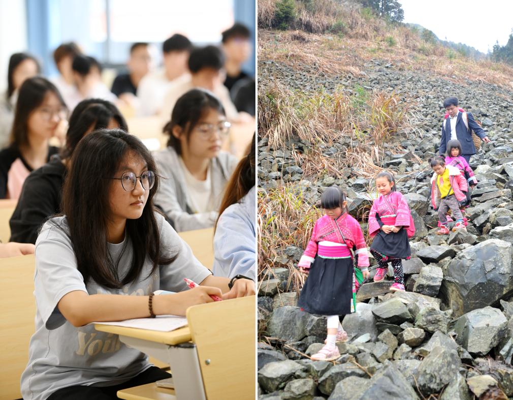 拼版照片。左图:在桂林信息科技学院,余茂鲜和同学在课堂上听课(2025年5月29日摄)。右图:在广西龙胜各族自治县龙脊镇江柳村,余茂鲜(左二)和老师同学走在去学校的路上(2013年2月26日摄)。