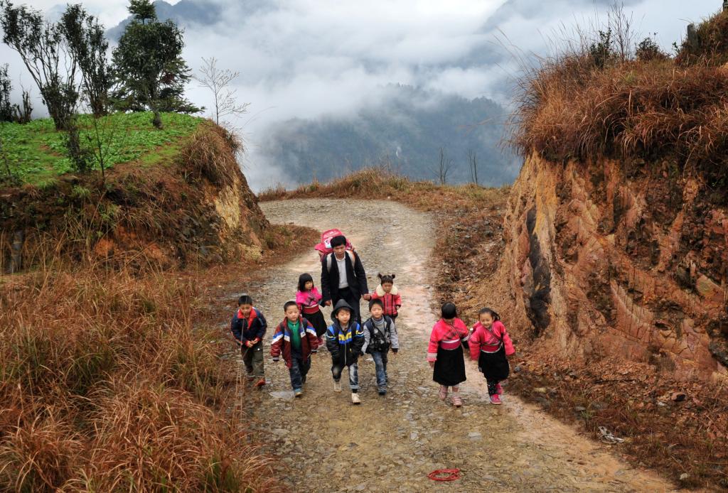 2013年2月26日,余启贵背着背篓领着孩子们走在上学的路上。