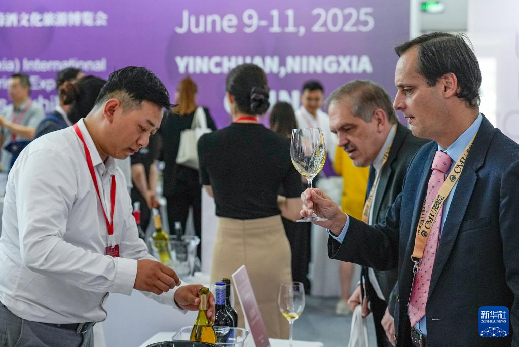 6月9日,观众(右一)在博览会期间举办的贸易洽谈活动现场品鉴葡萄酒。新华社记者 杨植森 摄