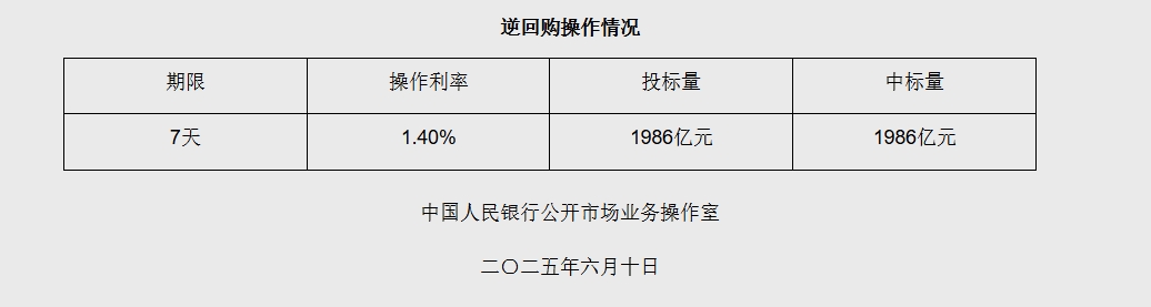 据央行网站消息,2025年6月10日中国人民银行以固定利率、数量招标方式开展了1986亿元逆回购操作。具体情况如下: