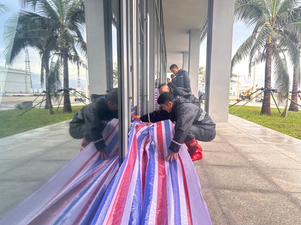 6月11日,三沙市工作人员正在对文体馆进行防风防汛处理。(三沙市新闻中心供图)