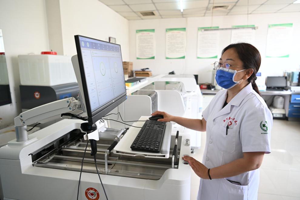 6月12日,在新河县人民医院,新捐献的生化免疫流水线投入使用。新华社记者 朱旭东 摄