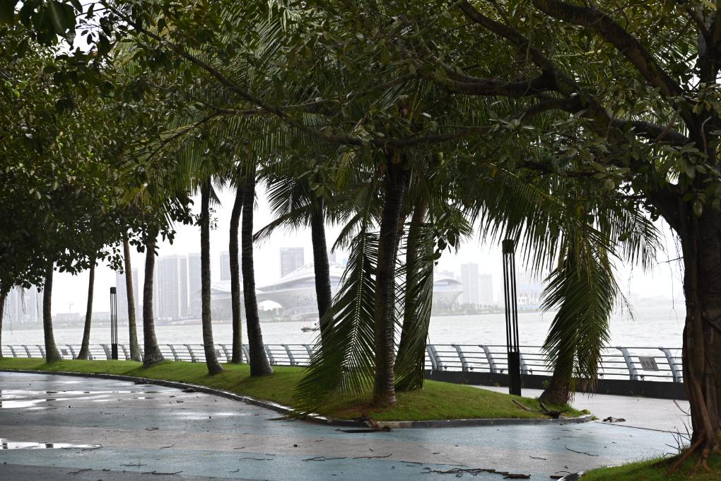 记者在湛江港一处综合避风水域看到,海面波涛起伏,船只整齐停靠在避风港。岸上的椰子树枝叶被风吹得有明显晃动,零星树枝被吹断,掉落在地上。一些建筑物门前提前堆放了防汛沙袋。
