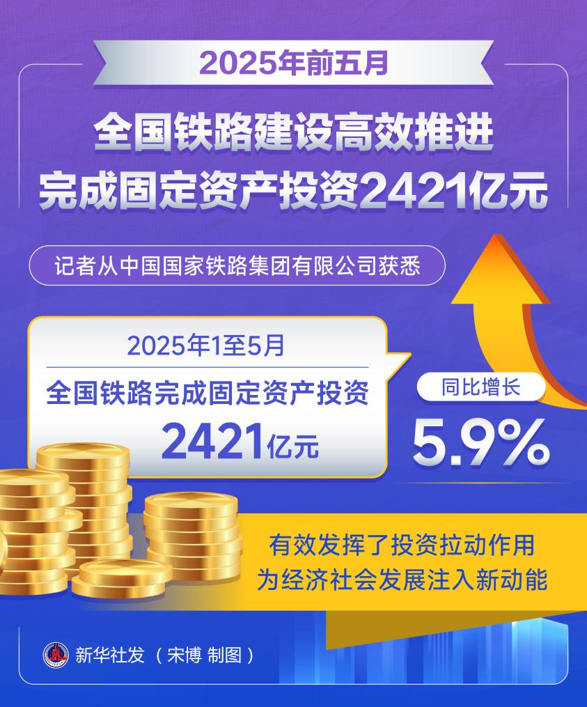 新华社北京6月15日电 题:今年前五月全国铁路建设高效推进 完成固定资产投资2421亿元
