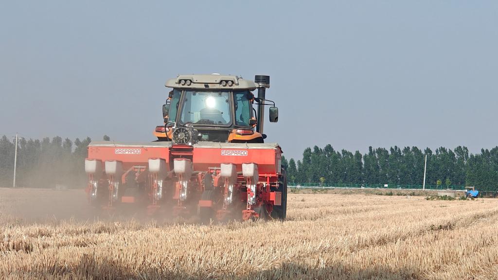 一季新麦刚刚收获,新的种子已经播下。在汶上县苑庄镇的农田里,一台大马力拖拉机正配合玉米精播机作业。铁犁碎开土块、刨出垄沟,玉米种子与肥料顺势播撒入土,种子的间距被精准控制在15厘米左右。