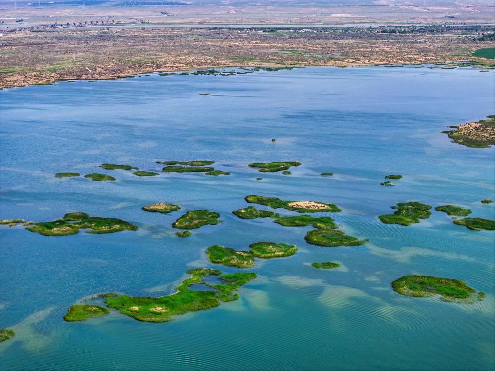 这是位于巴彦淖尔市磴口县的奈伦湖国家湿地公园(2025年6月5日摄,无人机照片)。新华社记者 连振 摄