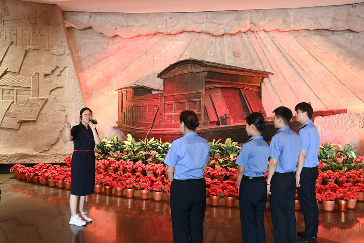 南湖革命纪念馆讲解员讲解“红船精神”。新华社记者 黄宗治 摄
