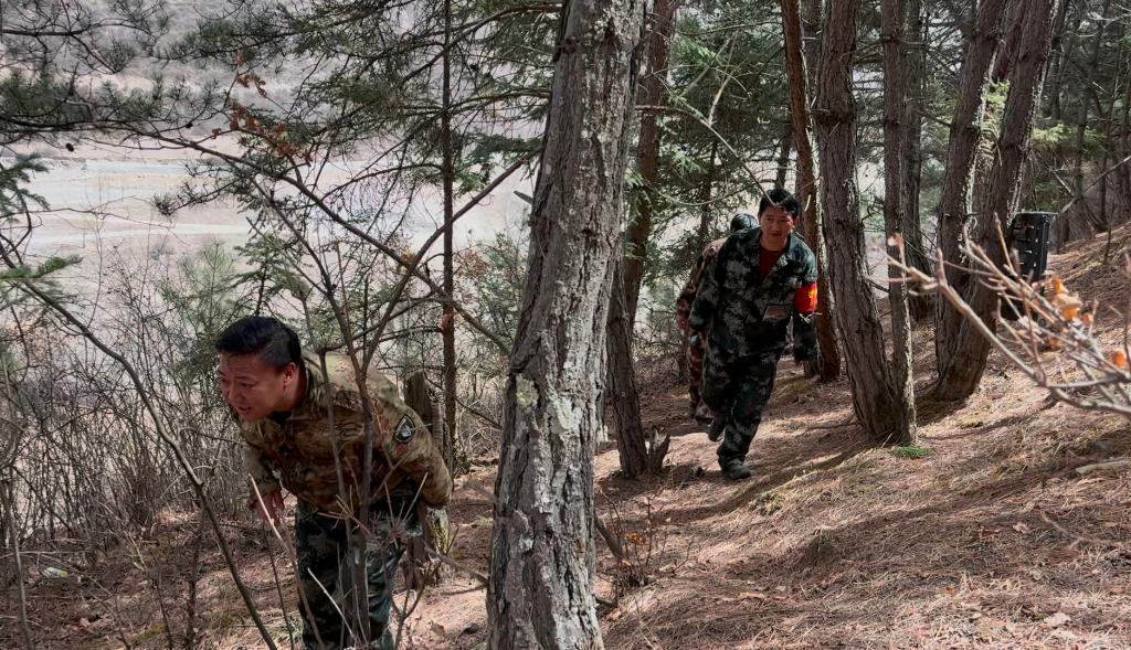 张路达(左一)和同事正在林间巡护。新华社记者 刁慧琳 摄