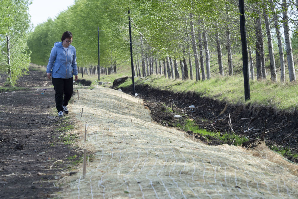 2022年5月23日,在黑龙江省海伦市前进镇光荣村,黑龙江省农业科学院科研人员在进行坡面生态修复的黑土坡耕地中查看治理情况。