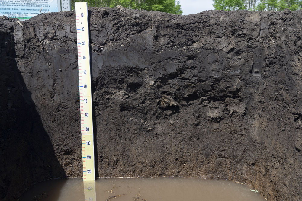 黑龙江省海伦市前进镇自新村农业科技示范基地内一处用来观测黑土层厚度的土壤剖面(2022年5月23日摄)。