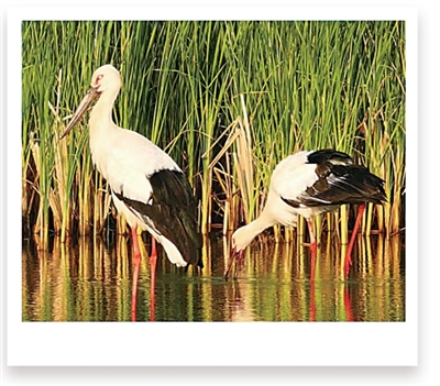 山东东营黄河口候鸟栖息地,东方白鹳在离巢穴不远的湿地里觅食。杨 斌摄
