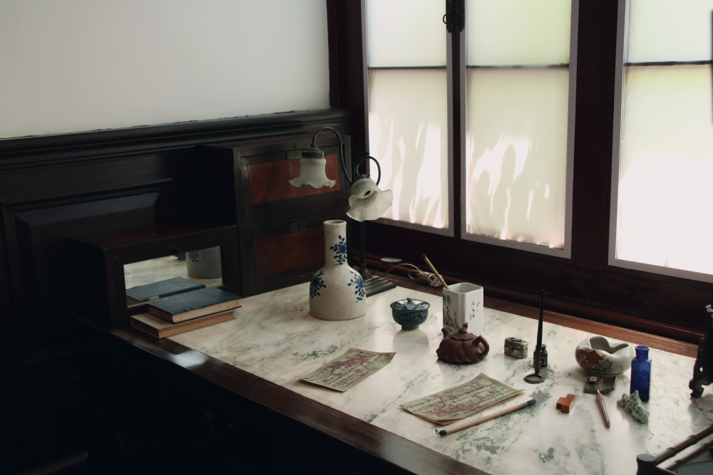 入房左手边是一架当时还很少见的钢琴,墙上是油画,钢琴上摆着古朴考究的西式烛台和棕色花瓶,墙角立着西式唱片机。然而床架、书柜、茶几、座椅都以敦实又稳重的红木打造,和其父亲读书办公的“中书房”风格是一致的。移目至右手边,书桌旁的衣架上挂着一件中式长袍,与一件黑色西装、一顶黑色绅士礼帽相邻,临窗而立的书桌上摆放着典型西式风格的花朵台灯,以及青花瓷瓶子、纸墨笔砚、茶壶,桌子侧边散放着几本蓝色封皮的硬壳笔记本。