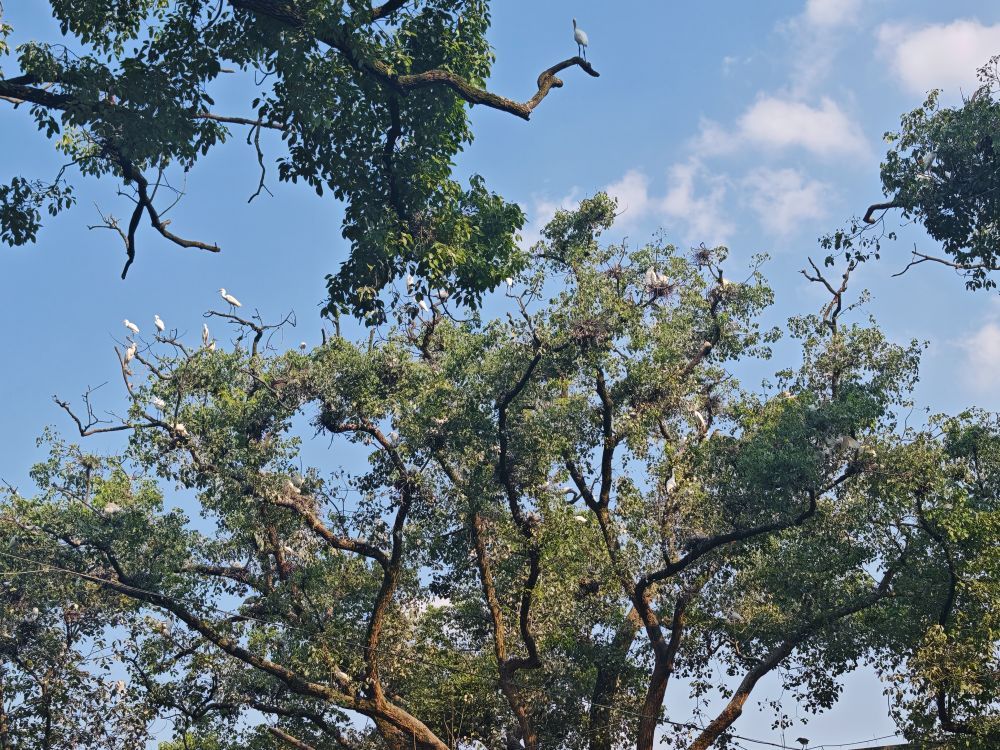 很快我就明白她的意思了,在景区通向校园的一条小路上,树旁站满了白鹭,道路中间也站了两三只。路中间因为鸟屎太多,成了“白路”。她介绍,学校师生常常是或打伞或快步通过这些鸟儿聚集的大树下,避免鸟屎“袭人”,有时走得慢了或是“运气好”,就会经历“六月飞雪”。